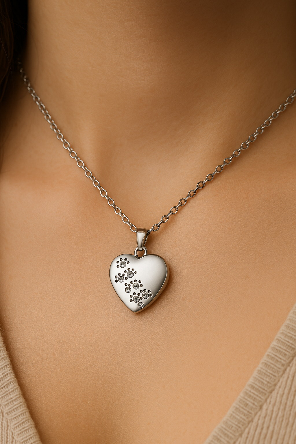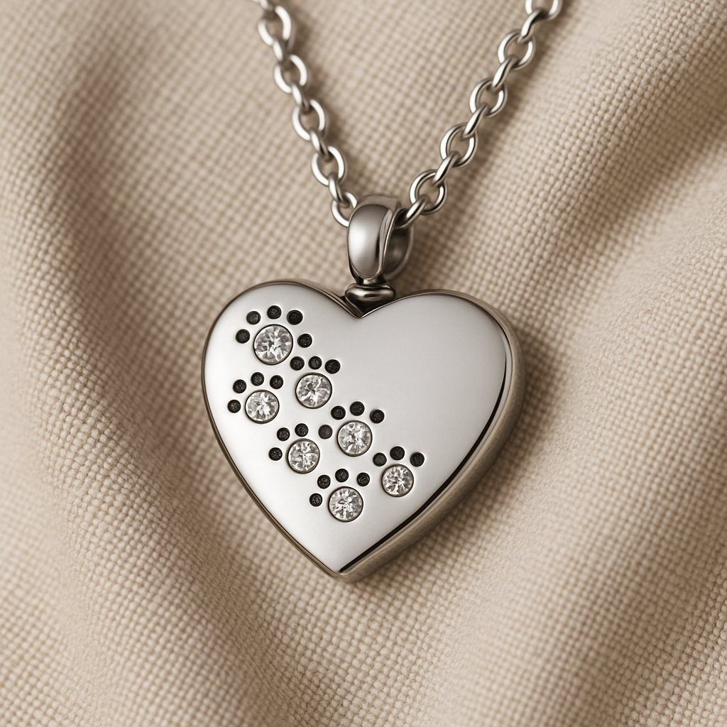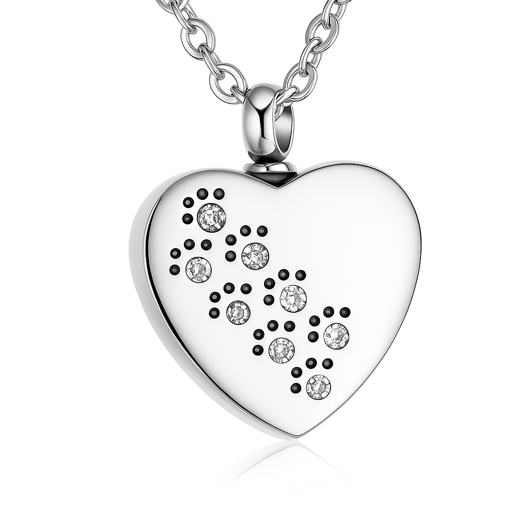Su forma de corazón representa el vínculo que continúa, mientras las huellitas delicadamente incrustadas simbolizan el camino compartido y la presencia que no se borra.