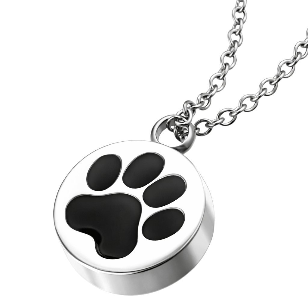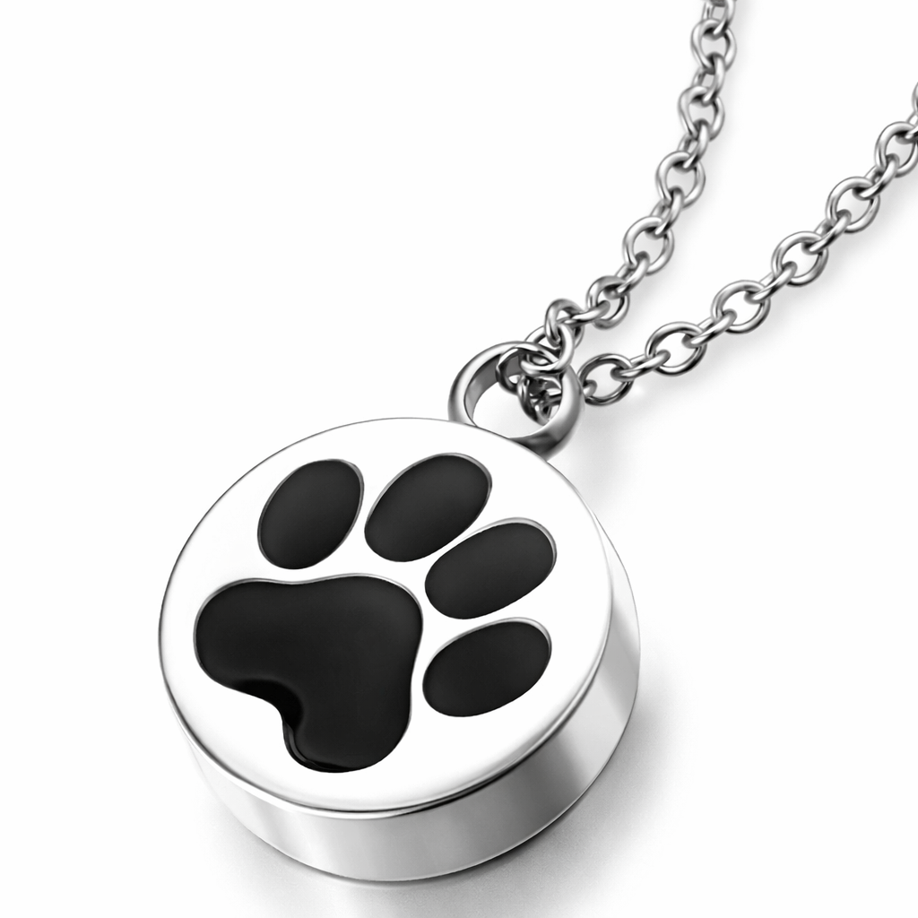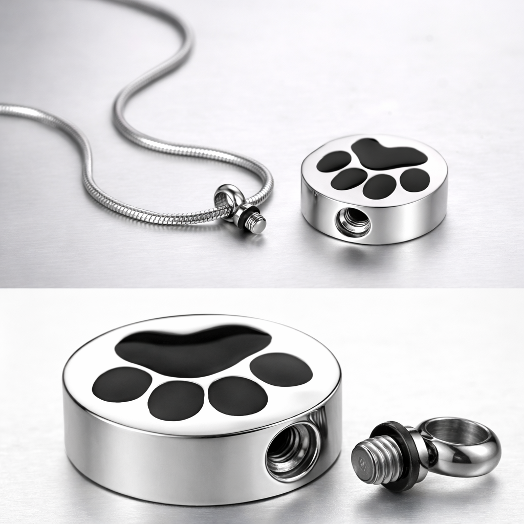 El collar para cenizas de mascotas con huella es una joya conmemorativa de acero inoxidable, diseñada para llevar siempre cerca el recuerdo de tu mascota. Su colgante circular con huella en relieve simboliza el vínculo y el amor que permanece.