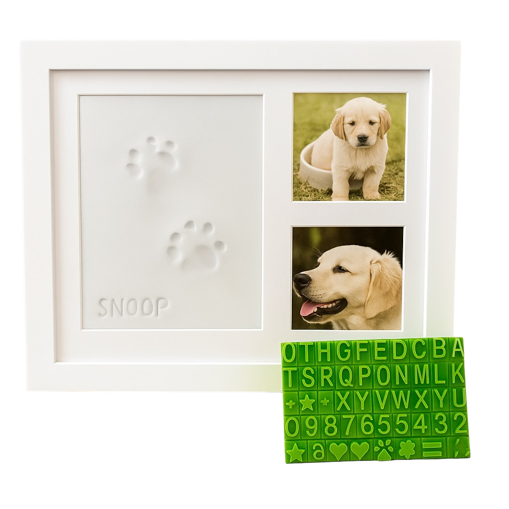 El kit marco huellas para perro o gato Huellas del Recuerdo es una forma conmovedora de conservar un momento especial. Incluye un marco blanco premium, arcilla “no-bake” segura para mascotas, un rodillo, plantilla y cinta para fotos.