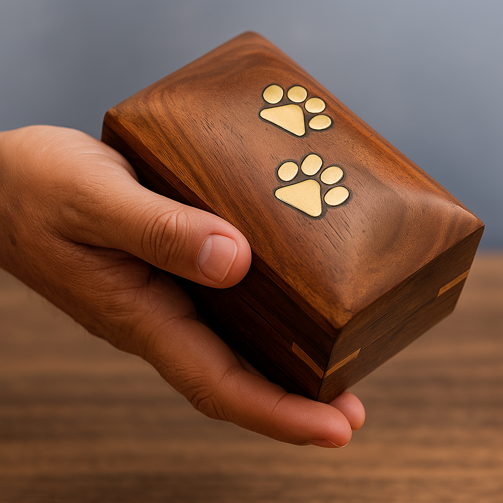 La madera pulida y los detalles metálicos hacen de esta mini urna un objeto único que habla del cariño y respeto que sentís por tu mascota. Es perfecta para perros y gatos pequeños, permitiendo mantener su recuerdo siempre cerca.