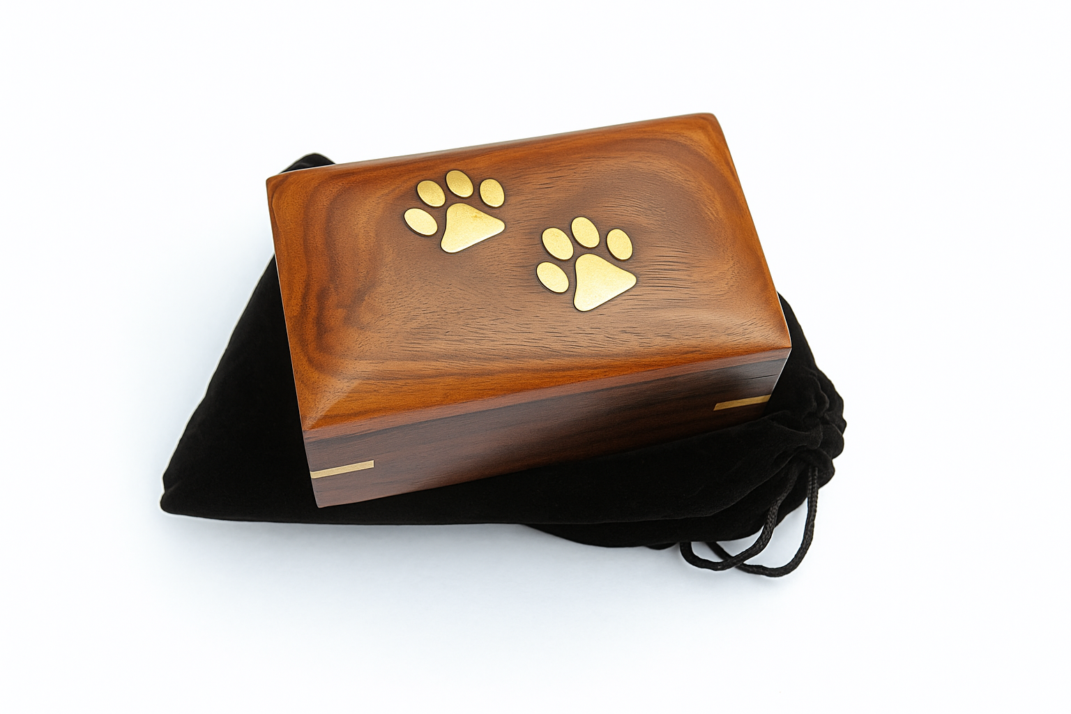 La Mini urna de madera para mascotas Colección Royal Matter es un homenaje elegante y discreto que combina calidez, detalle y significado. Esta pieza artesanal está hecha en madera maciza de palisandro indio, con detalles en latón que representan huellas y delicadas flores en las esquinas, dándole un toque sofisticado.
