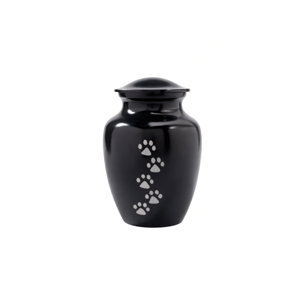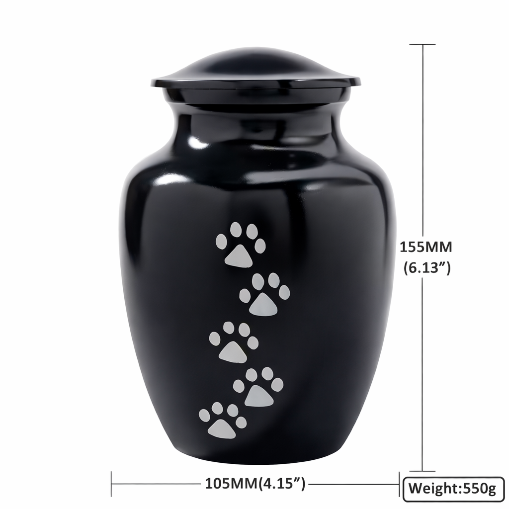 Urna de aluminio para mascotas de la Colección Memorial, fabricada artesanalmente en aleación de alta calidad. Cuenta con cierre a rosca seguro, base anti-rayaduras e incluye bolsa de terciopelo para su protección.