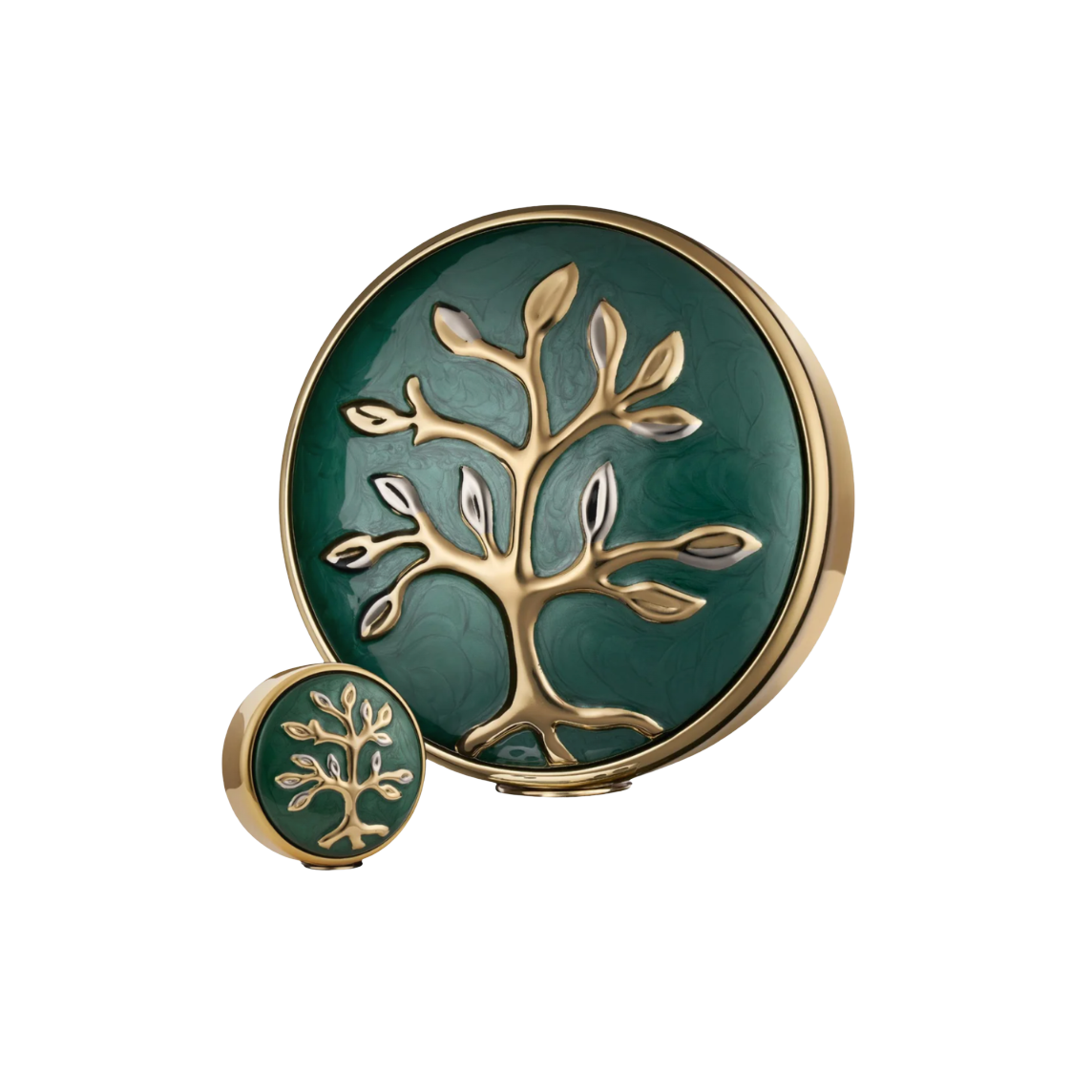 Su diseño circular representa la eternidad, mientras que el Árbol de la Vida simboliza la conexión, el recuerdo y la continuidad más allá del tiempo. El contraste entre el verde profundo y los detalles dorados genera una estética sofisticada, pensada para integrarse armoniosamente en cualquier espacio del hogar.